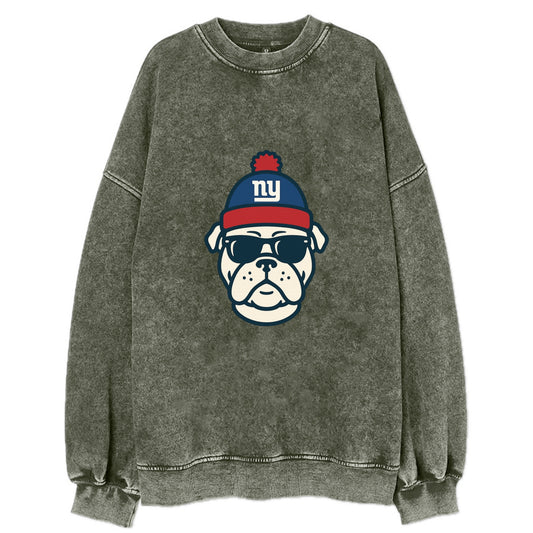 New York Bulldog wearing Giants blue and red beanie with pom pom and wayfarer - Vintage Sweatshirt