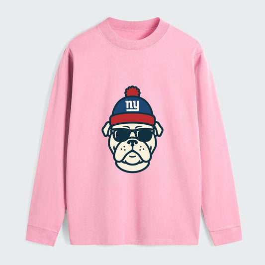 New York Bulldog wearing Giants blue and red beanie with pom pom and - Classic Long Sleeve Shirt