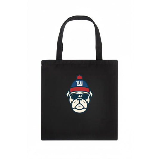 New York Bulldog wearing Giants blue and red beanie with pom pom and wayfarer sunglasses - Tote Bag
