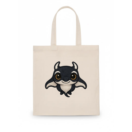 Baby Manta Ray - dark with white markings, cephalic fins, gentle eyes, front-facing, - Tote Bag