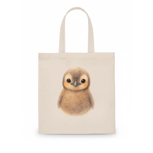 Baby King Penguin - orange cheek patches, fluffy brown, large eyes, front-facing, regal - Tote Bag