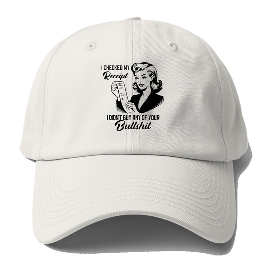 Revisé mi recibo. No compré ninguna de tus tonterías. Gorra de béisbol.