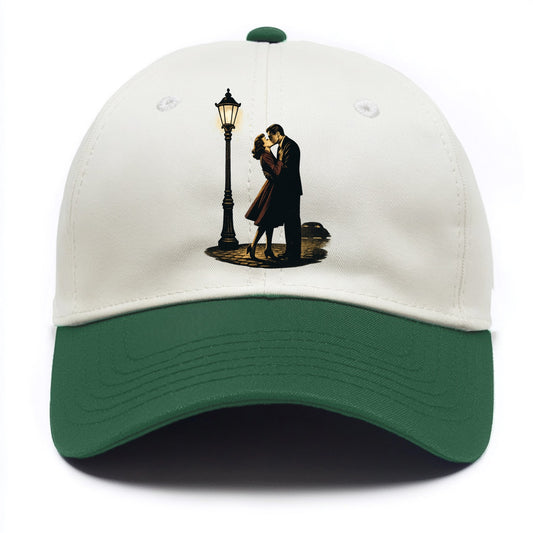 first kiss under vintage street lamp on cobblestone at night - Baseball Cap