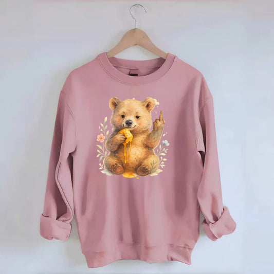 chubby bear cub eating dripping honey, sticky paw up with middle finger - Crewneck Sweatshirt
