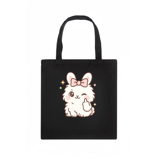 fluffy white angora rabbit with pink bow, one paw delicately flipping off - Tote Bag