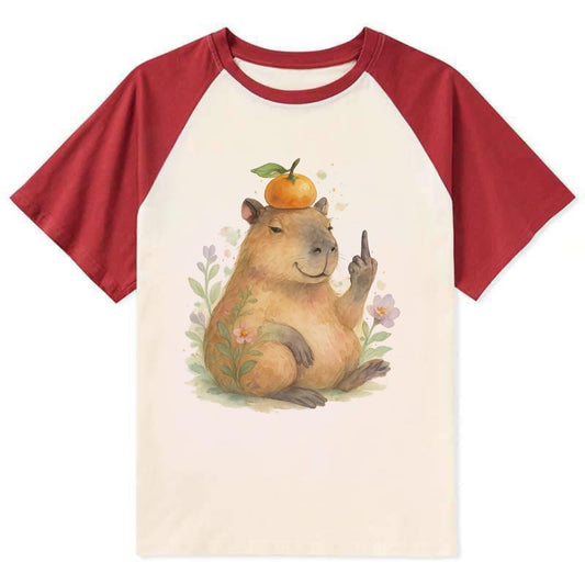 chonky capybara relaxing with orange on head, one webbed middle finger up - Contrast Raglan T-shirt