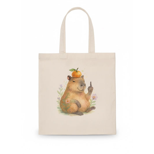 chonky capybara relaxing with orange on head, one webbed middle finger up - Tote Bag