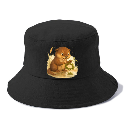 Otter weaving river reeds into a floating crown beside mirror-still water - Bucket Hat