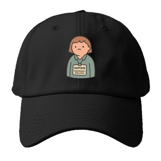 Worker wearing ID badge that says Human - Temporarily Employed - existential dread - Baseball Cap