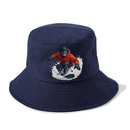 Snowboarder abriéndose paso a través de la nieve fresca con sombrero de pescador