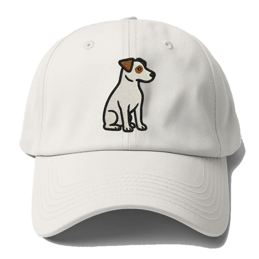 ジャック・ラッセル・テリアの白地に茶色のパッチが入った遊び心のある野球帽