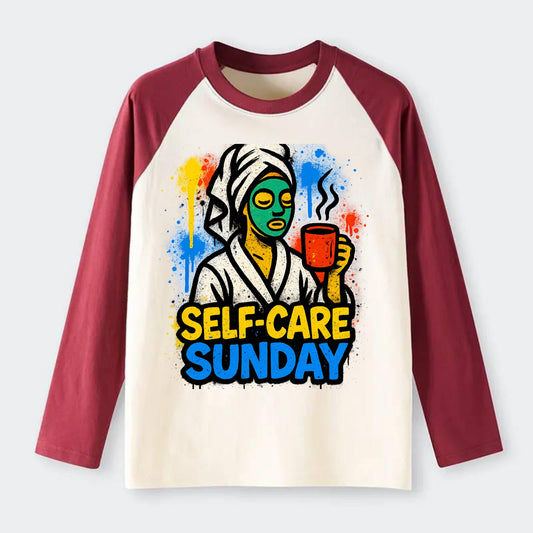 Person in bathrobe with face mask and tea - self-care Sunday ritual, - Contrast Raglan T-shirt
