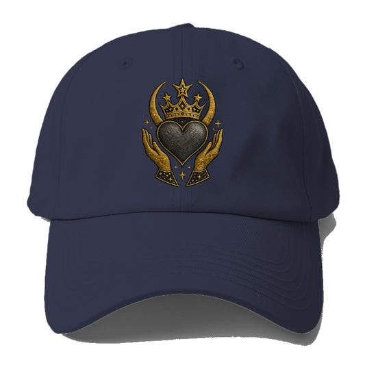 Hammered bronze warrior crown anchoring a dark steel heart with shield-bearing hands. - Baseball Cap