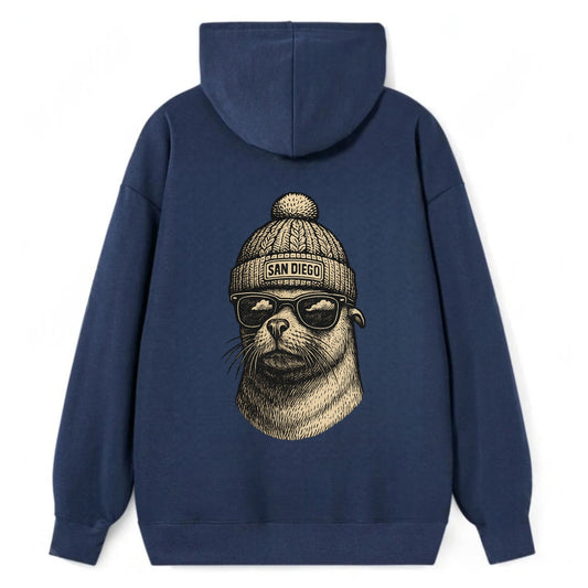 San Diego Sea Lion wearing San Diego beanie with pom pom and wayfarer - Classic Pullover Hoodie