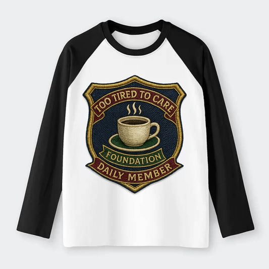 Crest with coffee cup - Too Tired To Care Foundation - Daily Member - Raglan Long Sleeve T-Shirt