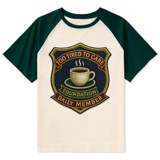 Crest with coffee cup - Too Tired To Care Foundation - Daily Member - - Contrast Raglan T-shirt