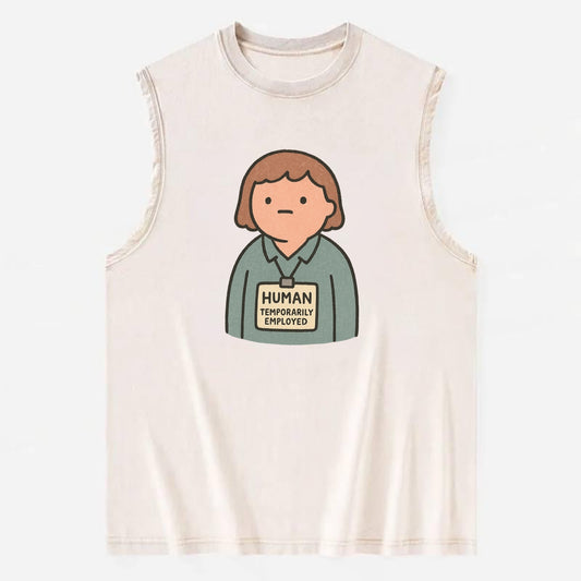 Worker wearing ID badge that says Human - Temporarily Employed - - Vintage Washed Tank