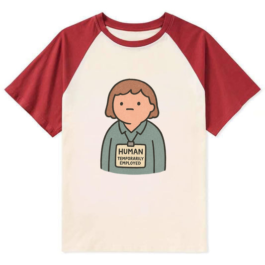 Worker wearing ID badge that says Human - Temporarily Employed - - Contrast Raglan T-shirt