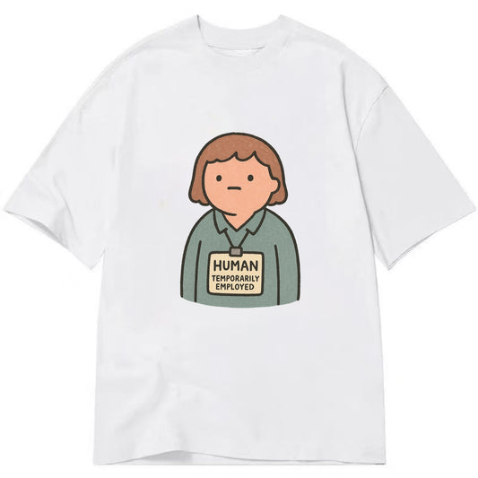 Worker wearing ID badge that says Human - Temporarily Employed - existential - Vintage T-shirt