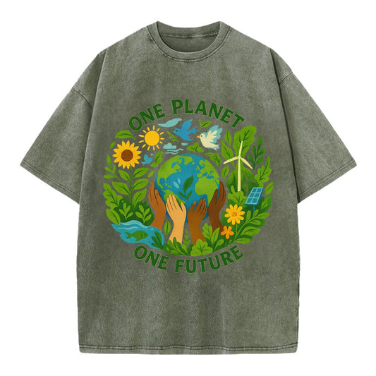 Globe surrounded by hands of all colors working together - One Planet, One - Vintage T-shirt
