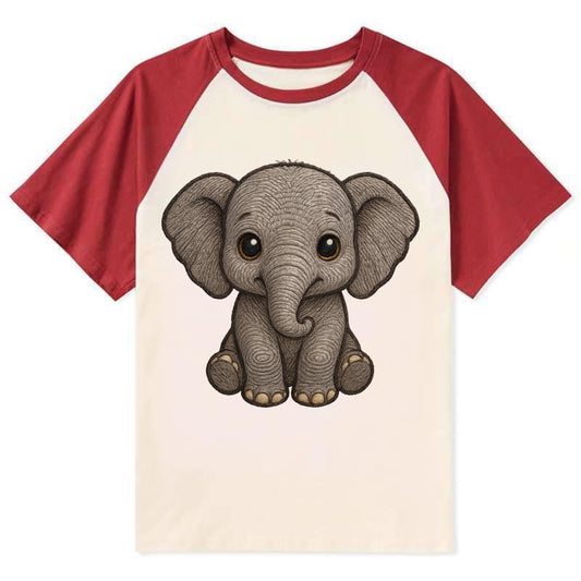 Baby Elephant - gray wrinkly, tiny trunk, large floppy ears, kind dark - Contrast Raglan T-shirt