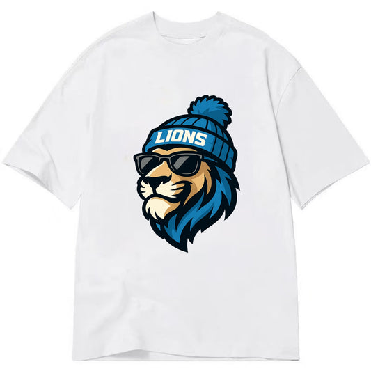 Detroit Lion wearing Lions Honolulu blue and silver beanie with pom pom and - Classic T-shirt