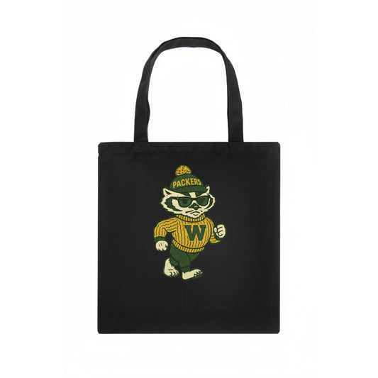 Wisconsin Badger wearing Packers green and gold beanie with pom pom and wayfarer - Tote Bag