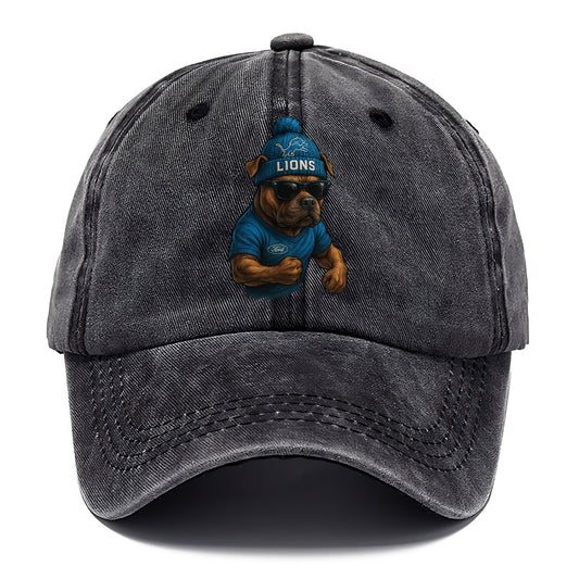 Detroit Pitbull wearing Lions beanie with auto patch and wayfarer sunglasses - Baseball Cap