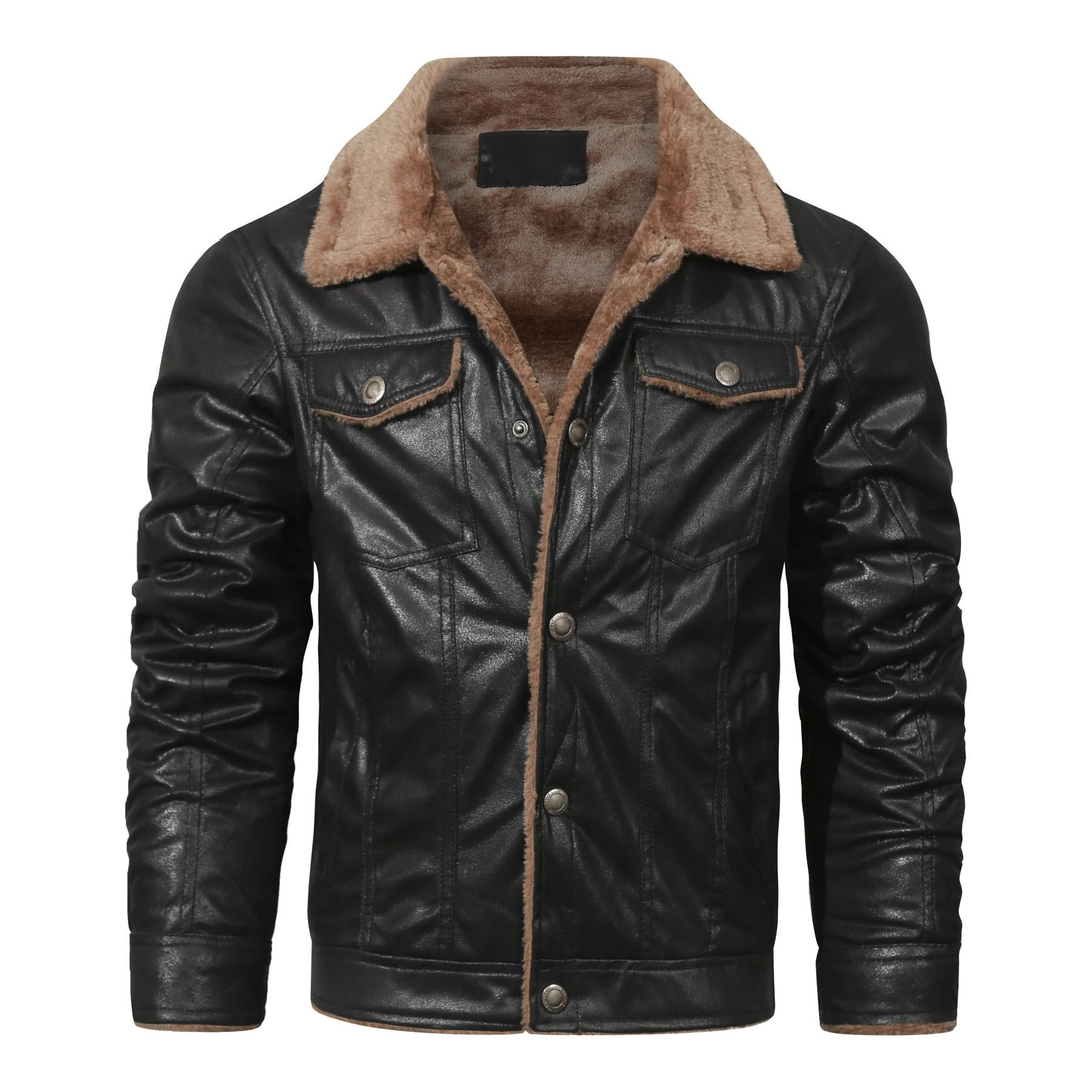 Men's Warm Fleece PU Leather Jacket, Casual Lapel Faux Leather Jacket Coat For Fall Winter